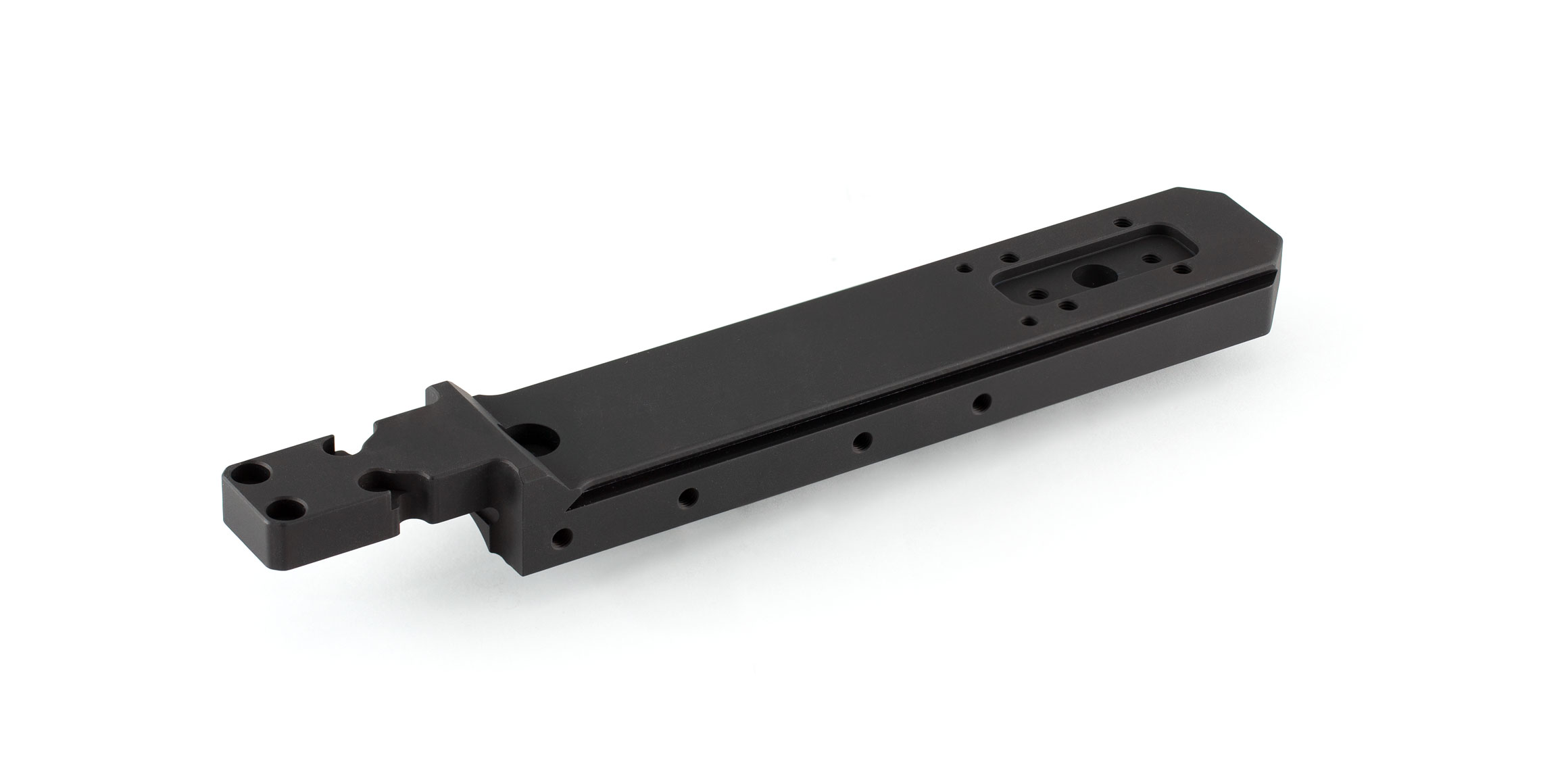 The Arca Spigot Mount XL is a modified version of the ARCA Spigot with an added 3.8" of forward throw ( 7.75" total). The Spigot Mount family is one of our most popular accessories as it allows all kinds of mounting options for your Whiskey-3, X-ray, or Bravo chassis, including sling and bipod mounts as well as NV rails. Like its standard length brethren, it features a bolt-on installation into the slot at the front of the chassis.