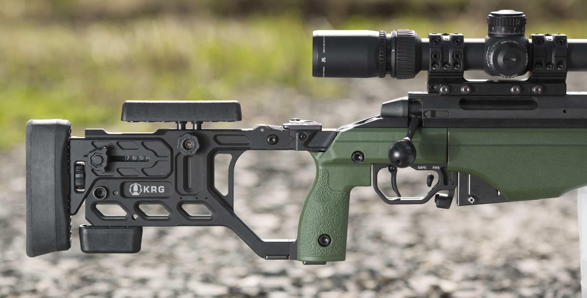 KRG folding rear stock on Sako TRG-22 in Sako Green; other KRG accessories shown are 2-stage trigger, barrel with barrel nut sytem, Spigot Mount, all for TRG-22/42, plus KRG shooting mat/rifle case